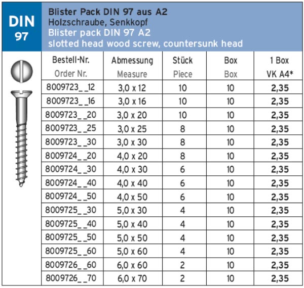 BOX 97 A2 Блистер. Нержавеющий шуруп по дереву с потайной головкой DIN 97