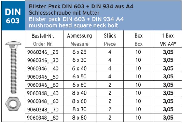 BOX 603 A4 Комплект. Нержавеющий мебельный болт с гайкой DIN 603 + DIN 934
