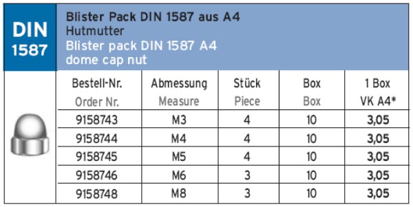 BOX 1587 A4 Блистер. Нержавеющая колпачковая гайка DIN 1587