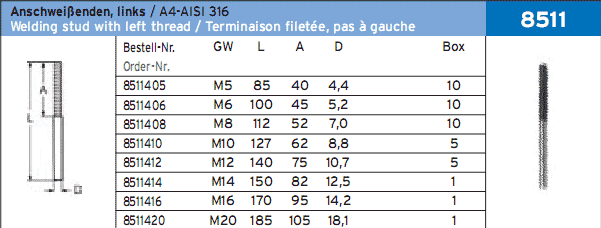 ШПИЛЬКА ДЛЯ ПРИВАРКИ С НЕПОЛНОЙ ЛЕВОЙ РЕЗЬБОЙ ART.-NR. 8511