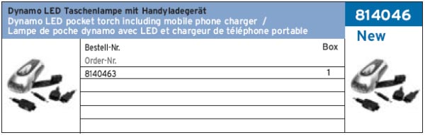 ФОНАРЬ С РУЧНОЙ ПОДЗАРЯДКОЙ И ВОЗМОЖНОСТЬЮ ЗАРЯДКИ ТЕЛЕФОНА ART.-NR. 814046