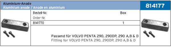 АНОДНЫЙ ПРОТЕКТОР ДЛЯ VOLVO PENTA 290, 290DP, 290 A,B & D ART.-NR. 814177 ALUMINIUM