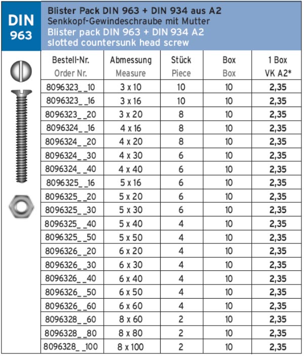 BOX 963 A2 Комплект. Нержавеющий винт с потайной головкой и гайкой DIN 963 + DIN 934