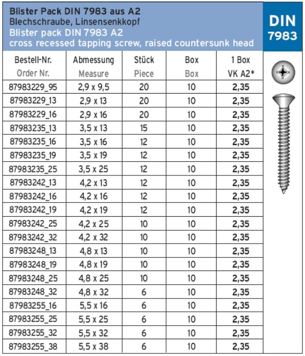 BOX 7983 A2 Блистер. Нержавеющий шуруп с полупотайной головкой DIN 7983