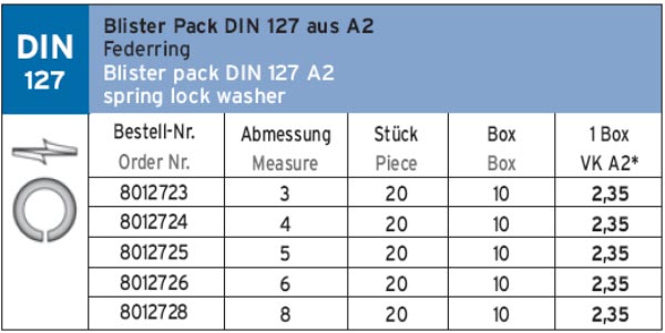 BOX 127 A2 Блистер. Нержавеющая шайба - гровер DIN 127