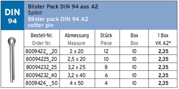 BOX 94 A2 Блистер. Шплинт нержавеющий DIN 94