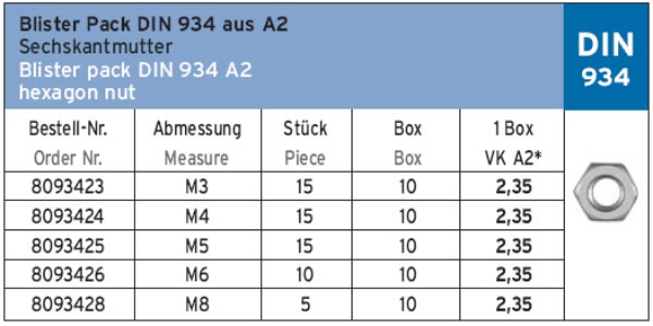 BOX 934 A2 Блистер. Нержавеющая гайка шестигранная DIN 934
