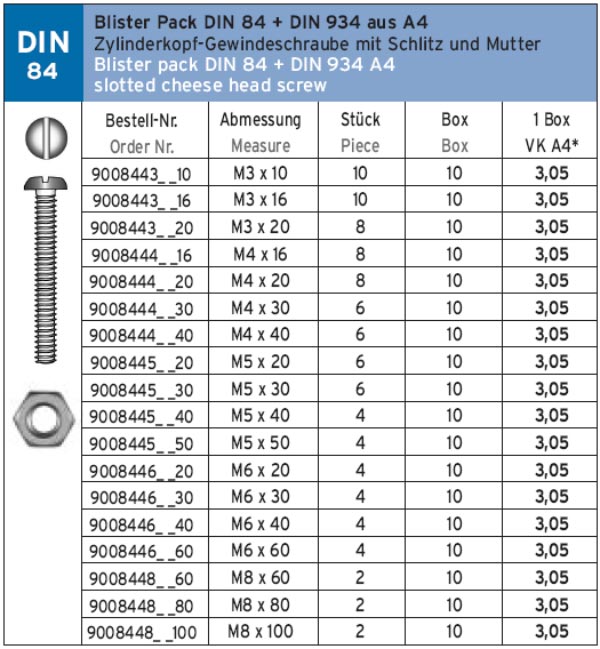 BOX 84 A4 Комплект. Нержавеющий винт с полукруглой головкой и гайкой DIN 84 + DIN 934