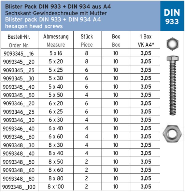 BOX 933 A4 Комплект. Нержавеющий шестигранный болт с гайкой DIN 933 + DIN 934