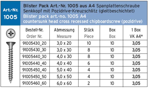 BOX 1005 A4 Блистер. Нержавеющий потайной саморез
