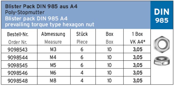 BOX 985 A4 Блистер. Нержавеющая гайка со стопорным кольцом DIN 985