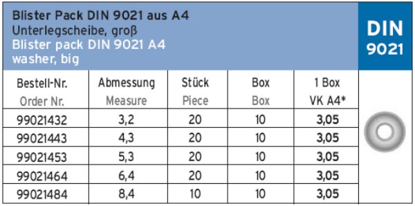 BOX 9021 A4 Блистер. Нержавеющая шайба широкая DIN 9021