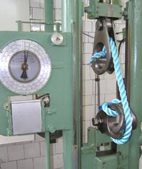 Прочность канатов характеризуется суммарной прочностью каболок и разрывным усилием каната в целом (агрегатная прочность). Агрегатная прочность меньше суммарной: чем больше крутка или чем больше число круток, тем меньше агрегатная прочность по отношению к суммарной. Прочность определяется в лаборатории, разрывая отдельные каболки на динамометре, или весь канат на специальной машине (см. фото). Среднее арифметическое разрывных усилий каболок, умноженное на число каболок в канате, дает суммарную прочность.